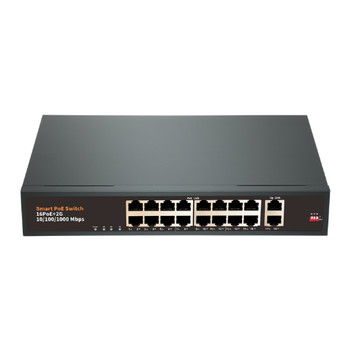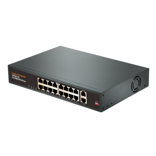 The EV-G1620GBL-A is a high-performance 16-port PoE+ switch designed for professional network deployments requiring both data and power delivery. The EV-G1620GBL-A features 16×10/100/1000Mbps RJ45 ports that support PoE+ functionality, delivering up to 30W per port with a substantial total power budget of 250W. This robust switch includes two additional 10/100/1000Mbps gigabit uplink ports for high-speed network backbone connections. The EV-G1620GBL-A incorporates intelligent power priority management, ensuring critical devices maintain operation during high power demands. With a 16Gbps switching capacity, 4K MAC address table, and support for IEEE 802.3af/at standards, this switch is ideal for powering and connecting multiple devices such as IP cameras, wireless access points, VoIP phones, and other PoE-enabled equipment in commercial, industrial, and surveillance applications.
